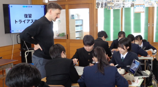 「復習トライアスロン」今日はALTのトム先生もいらっしゃっていて、2人体制で指導に当たっていました。