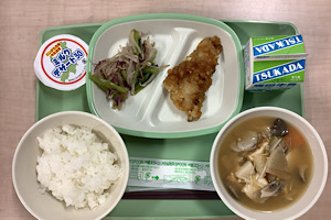 今日は「キラッと新潟 地場もん献立」です。新潟県は米どころです。地元産のお米を使った白いごはんを主食として、市内産地場産物を取り入れたおかずを給食でいただきます。白身魚の唐揚げには、南区産の梨を使っ …