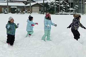 1年生 生活科「ふゆとともだち」 まとまった雪が積もり、校庭は一面真っ白の銀世界となりました。グラウンドへ出た1年生は、雪の感触を楽しんだり、雪合戦をしたりして、雪を満喫していました。