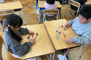 2年生の算数では「はこの形」の学習をしました。模型を使って辺の本数や頂点の数を調べました。指定された形を作るには、辺となる棒が何本必要か、頂点となる球が何個必要か、グループで相談しながら楽しんで活 …