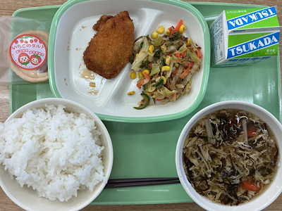 5月23日(木)の給食で「カラフルビーンズ」がでました。水で戻して油で揚げた大豆、下味をつけたこんんにゃく、にんじん、ピーマンを甘辛いみそだれであえた料理です。給食は、いろいろな大豆料理がでてきます。大豆は「畑の肉」といわれるほど、たんぱく質が多く含まれています。血液をきれいにしたり、便秘の予防効果もあります。残さず食べて元気な体をつくりましょう。