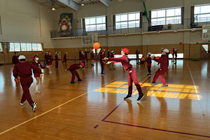 消防の方のお話を聞いた後、水消火器を使う体験をしたり、消防服を着る体験をしたりしました。水消火器はとても重くて子どもたちの力では持ち上がらず、置いたまま的を目がけて放水の練習をしました。消防服を着る体験では、消防用のヘルメットの重さや長袖で消火活動をすることを知り、消防士さんの大変さを感じた子どもたちでした。
