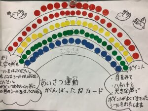 今日は、企画委員会主催の月1回のあいさつ運動の日でした。元気にあいさつすると、企画委員の人からシールがもらえます。もらったシールはそれぞれの教室にあるカードに貼って、みんなの力で虹を描くという取組です。今日の担当学年は3年生、元気いっぱいの声が響いていました。