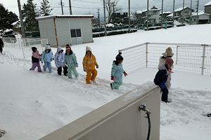 まとまった雪が積もり、校庭は一面真っ白の銀世界となりました。グラウンドへ出た1年生は、雪の感触を楽しんだり、雪合戦をしたりして、雪を満喫していました。