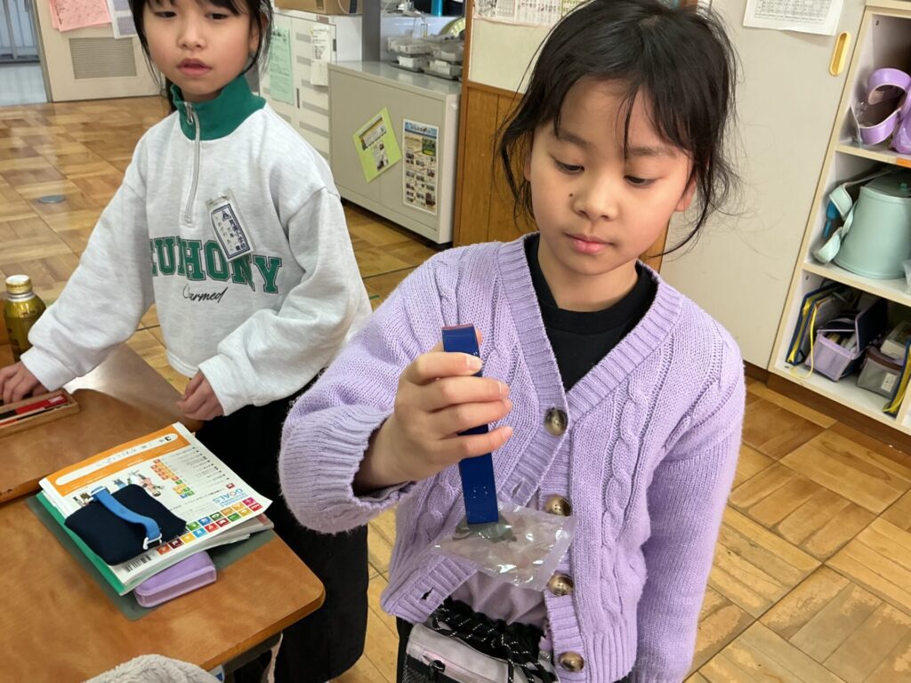 アルミ缶、スチール缶、お金、砂鉄、校内の廊下の手すりなどをグループで調べてみました。