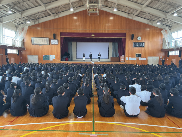 後期終業式を行いました。 最初に書道と、いきいきわくわく科学賞の表彰の報告がありました。 集会などのピアノ伴奏を、今日から新しく担当する生徒の紹介がありました。 1年生、2年生、生徒 …