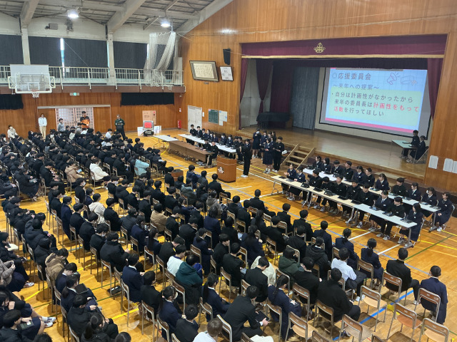 3学年委員長と副委員長が議長に選ばれました。活動報告では、本部役員、専門委員長、部活動の部長が今年度の様々な取組について、緊張しながらも堂々と説明していました。