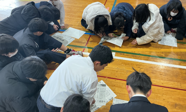 クラスごとに、拡大した10枚の新聞紙が配られます。その中からお題の文字を1文字ずつ探して切り抜きます。