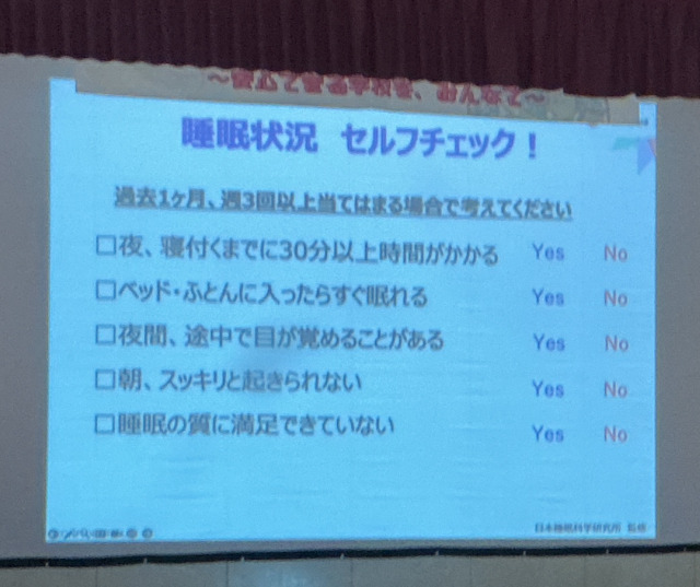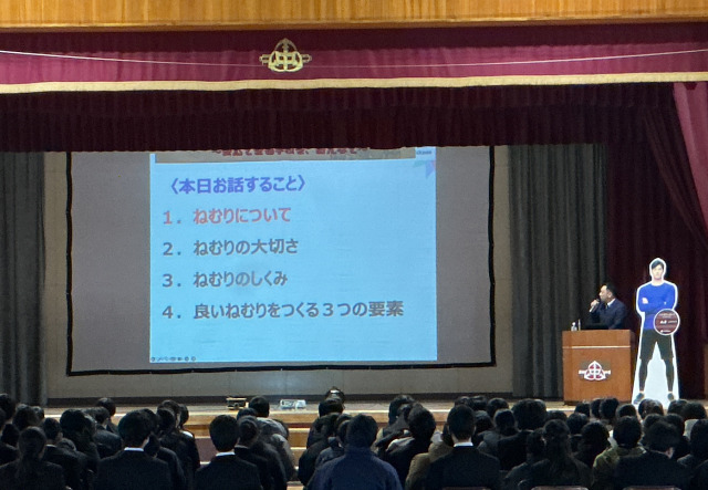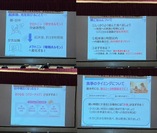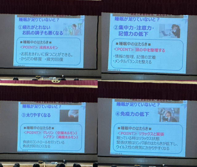 『①ねむりについて』、『②ねむりの大切さ』、『③ねむりのしくみ』、『④良いねむりをつくる3つの要素』についてお話をしてくださいました。