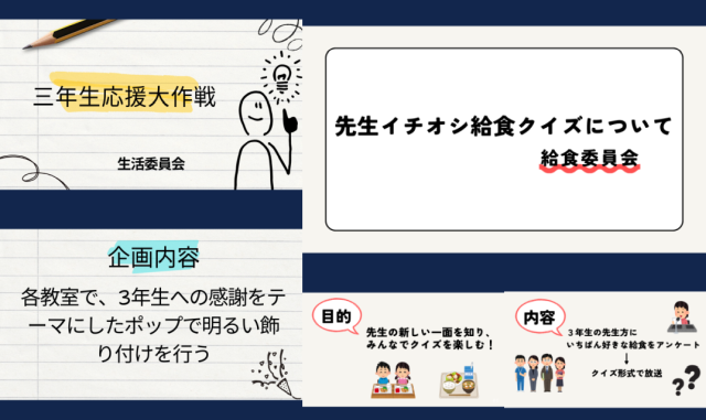どの委員会も、3年生に感謝の気持ちを伝えたいと、素敵な企画を用意してくれました。3年生が登校するのはあとわずかですが、内野中学校で過ごしてきてよかったなと思える日々になることを願っています。
