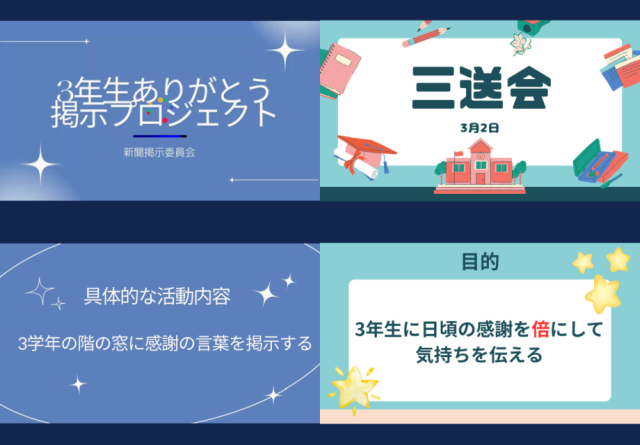 企画してくれた本部、専門委員会の皆さん、ありがとうございました。また、卒業式前日の3月2日(月)には三送会があります。お世話になった先輩方に感謝の気持ちを直接伝え、3年生を見送りたいと思います。