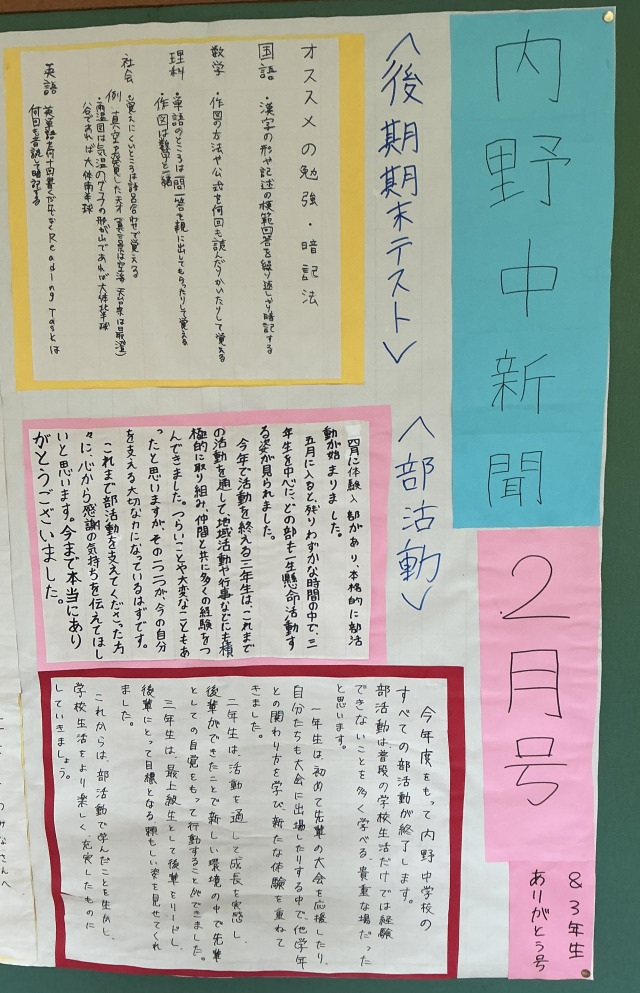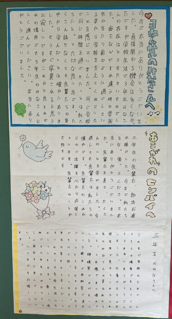 3年生が卒業するまで1週間を切りました。今まで1・2年生を引っ張ってくれた3年生の皆さん、ありがとうございました。
