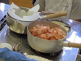 どういったメニューを和食と呼ぶか、ということから授業が始まり、だしの基本について教えていただいた後は、実際に目の前でだしを作ってくださいました。