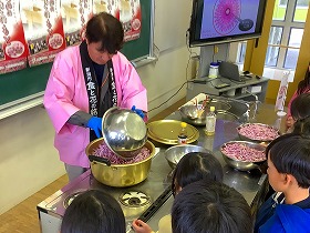 沸騰したお湯に、酢を入れてゆでてくださいました。子どもたちは、興味津々に鍋を見つめていました。