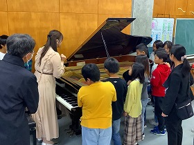 グランドピアノの音の出る仕組みなどを解説していただき、子どもたちはピアノの近くでじっくりと観察しました。