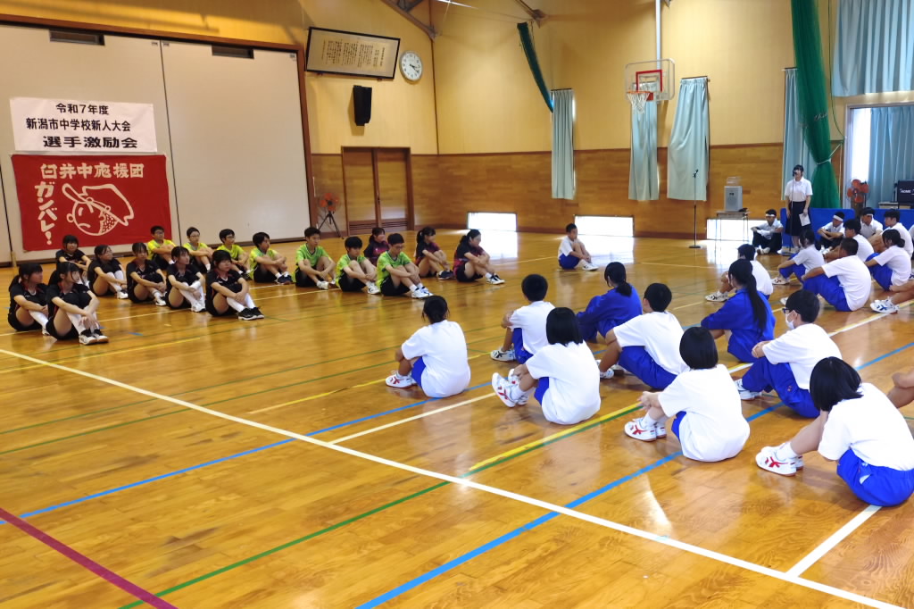 【今日の臼井中学校】 新人戦の激励会を行いました。3年生が引退して、はじめて1,2年生だけで大会に出場します。やや院長気味の表情が初々しいです。 全校生徒で応援歌を歌い、エールで声出しを …