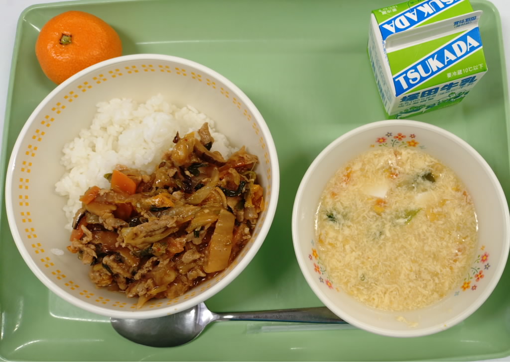 麦ごはん、ポークカレー、梨入りヨーグルト和え、乾燥小魚、牛乳