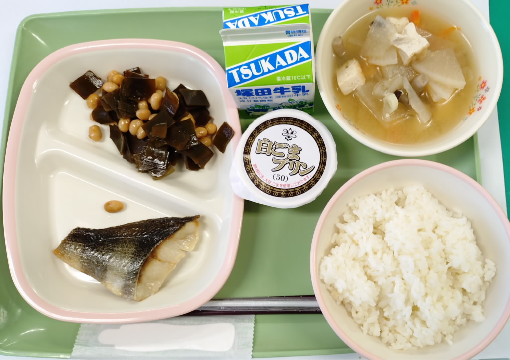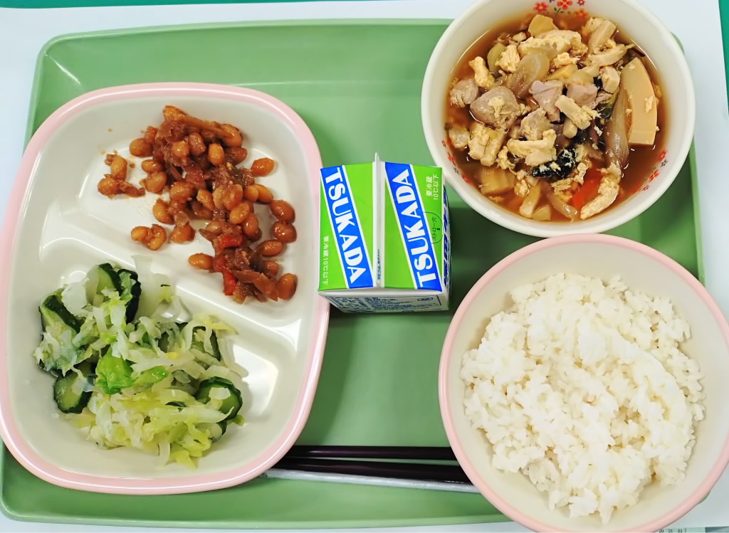 ごはん、高野豆腐入り親子煮、鉄火味噌、たくあん和え、牛乳