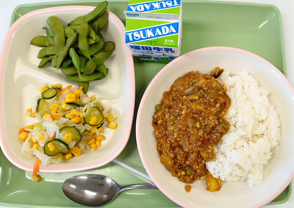 ごはん、秋野菜のキーマカレー、コーンサラダ、枝豆、牛乳