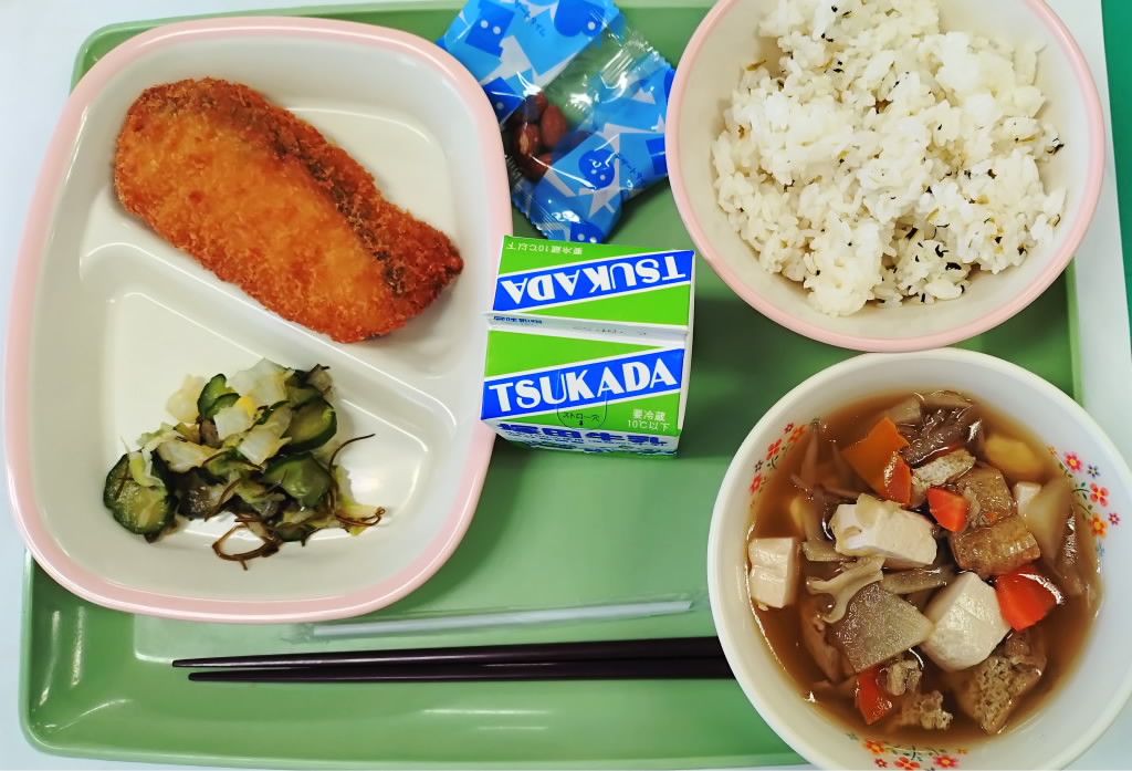 菜飯、鳥ごぼう汁、鮭チーズフライ、白菜漬け、アーモンド、牛乳
