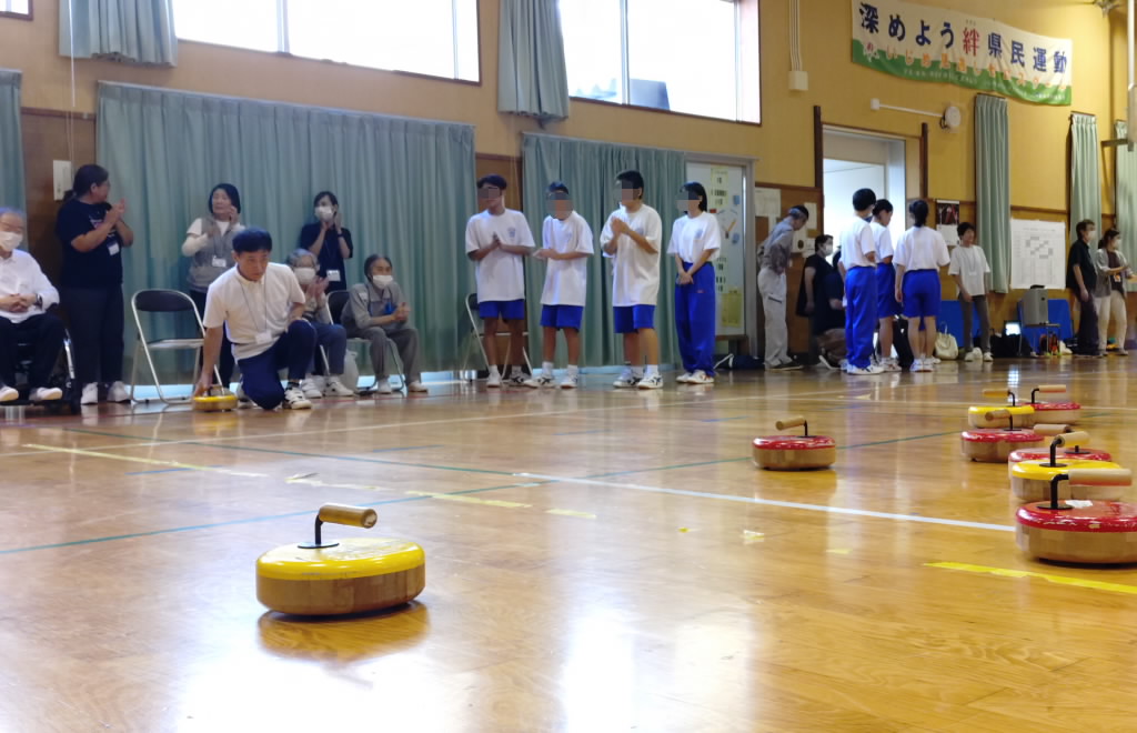 地域やお年寄りの皆さんからカーリングを投げていただくと、自然と拍手が沸き起こり、体育館全体が和やかな雰囲気に包まれました。生徒だけでなく、参加者の皆さんにフロアカーリングを楽しんでもらえたようです。