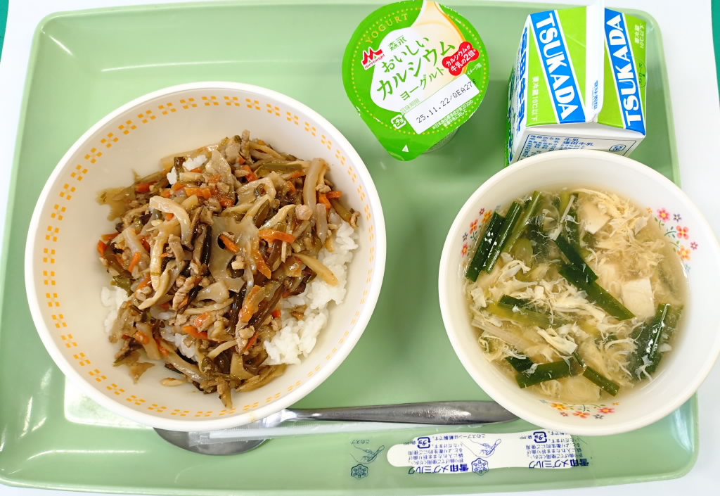 ごはん、きんぴら丼、アサリ入りにら玉スープ、ヨーグルト、牛乳