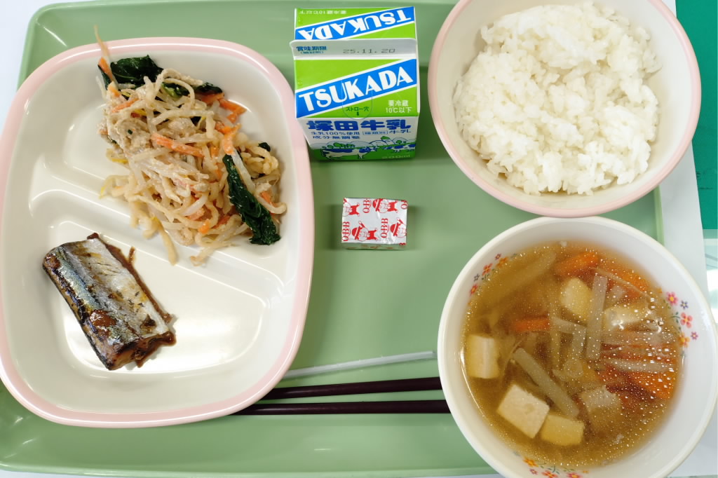 ごはん、芋の子汁、さんまの生姜煮、ゴマ酢和え、チーズ、牛乳