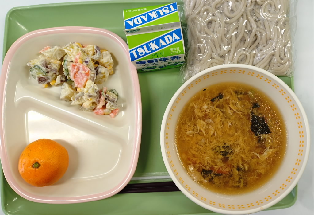 大麦麺、卵とじ汁、ヨーグルト入りサツマイモサラダ、みかん、牛乳