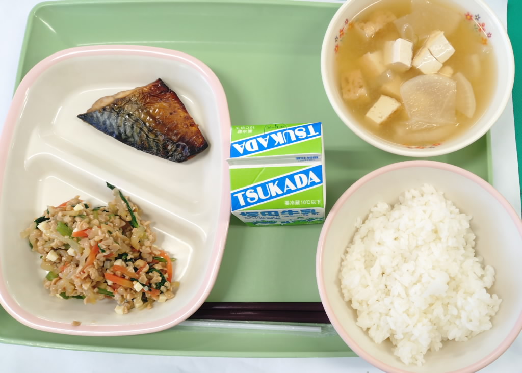 ごはん、大根と生揚げの味噌汁、サバの照り焼き、チーズ入りきりざい、牛乳