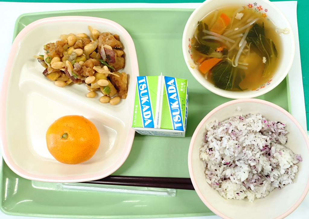 ゆかりごはん、ホタテとチンゲン菜のスープ、鶏肉とサツマイモの揚げ煮、みかん、牛乳