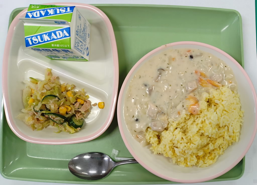 カレー味ごはん、鶏肉とアサリのクリームソース、ツナとコーンのサラダ、牛乳