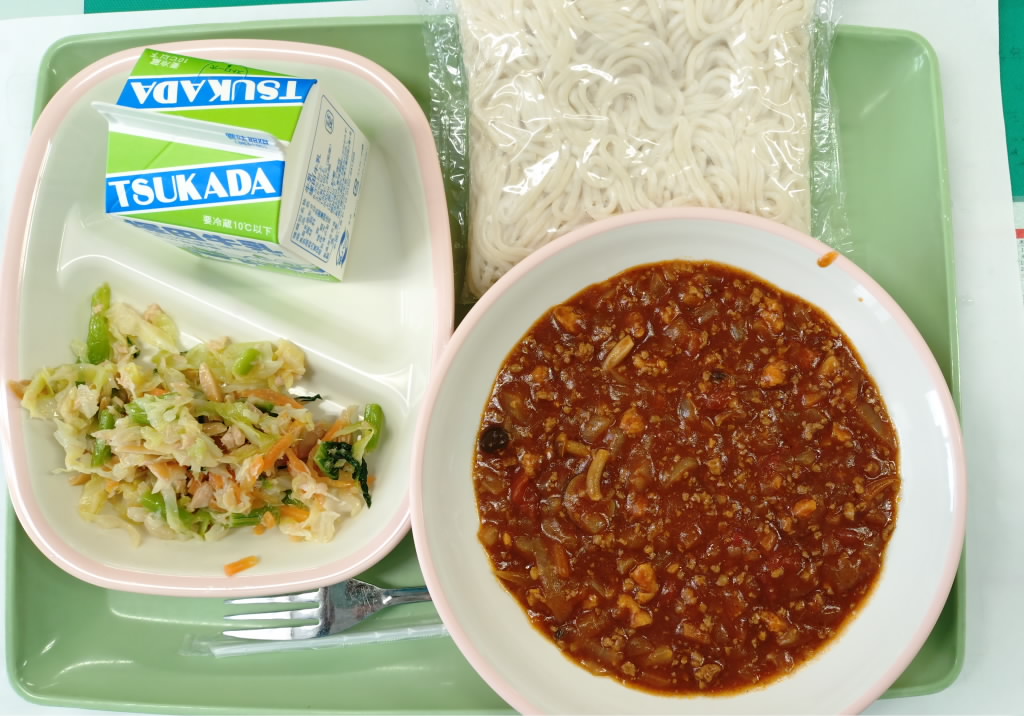 ソフト麺、チーズ入りミートソース、アーモンド入り胡麻ツナサラダ、牛乳
