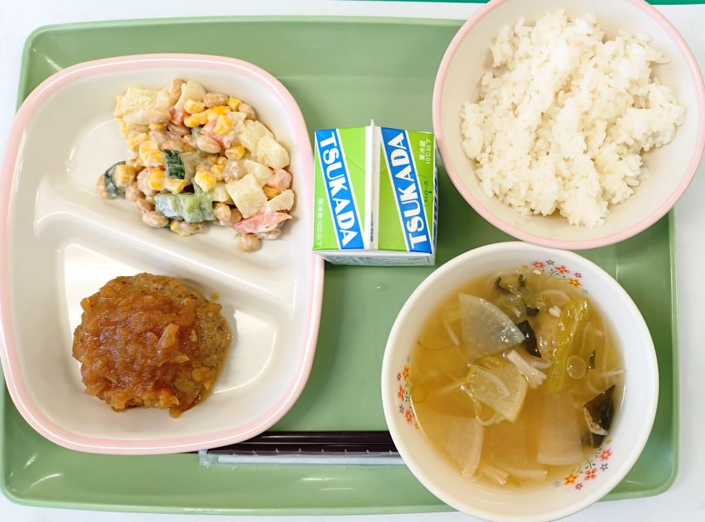 ごはん、大根と油揚げの味噌汁、ハンバーグの玉ねぎリンゴソース、コロコロビーンズサラダ、牛乳