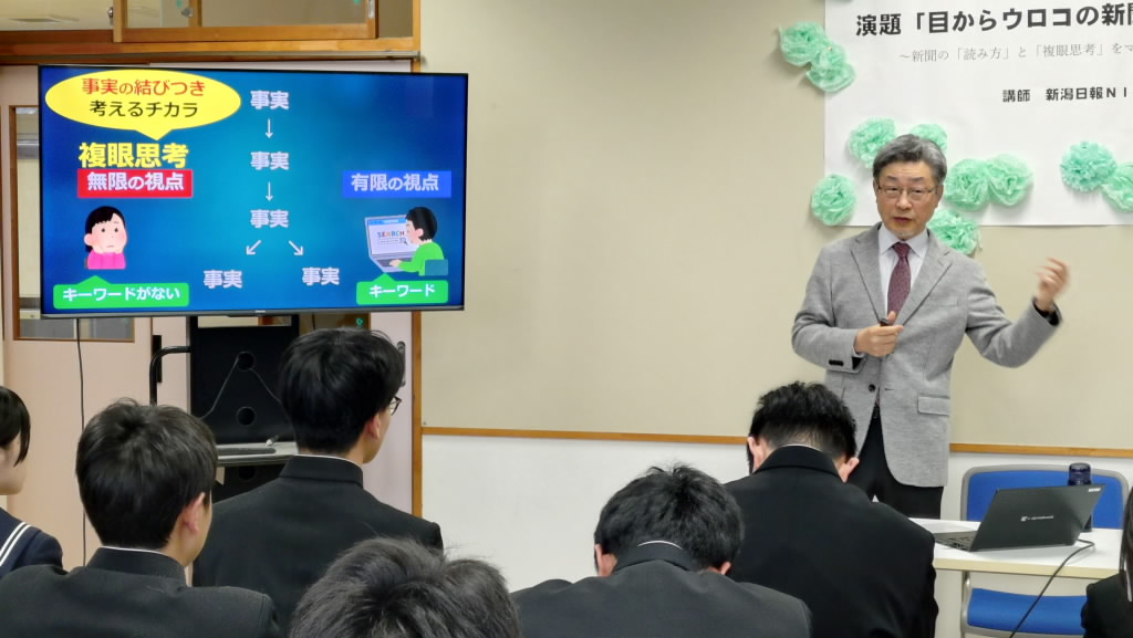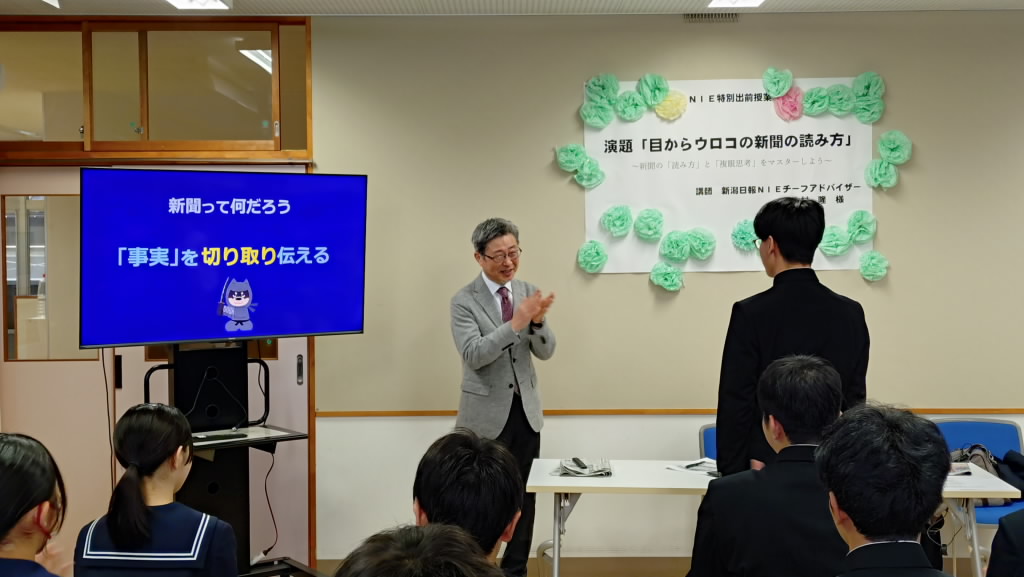 NIE特別出前授業として、新潟日報NIEチーフアドバイザーの木村隆様よりご来校いただき「目からウロコの新聞の読み方~新聞の「読み方」と「複眼思考」をマスターしよう~」のテーマでご講演をいただきました。