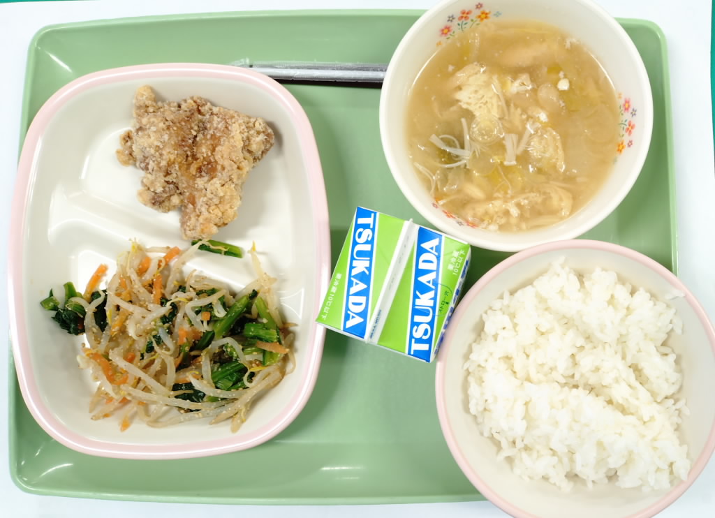 ごはん、白菜の味噌汁、鶏肉の竜田揚げ、ゴマびたし、牛乳