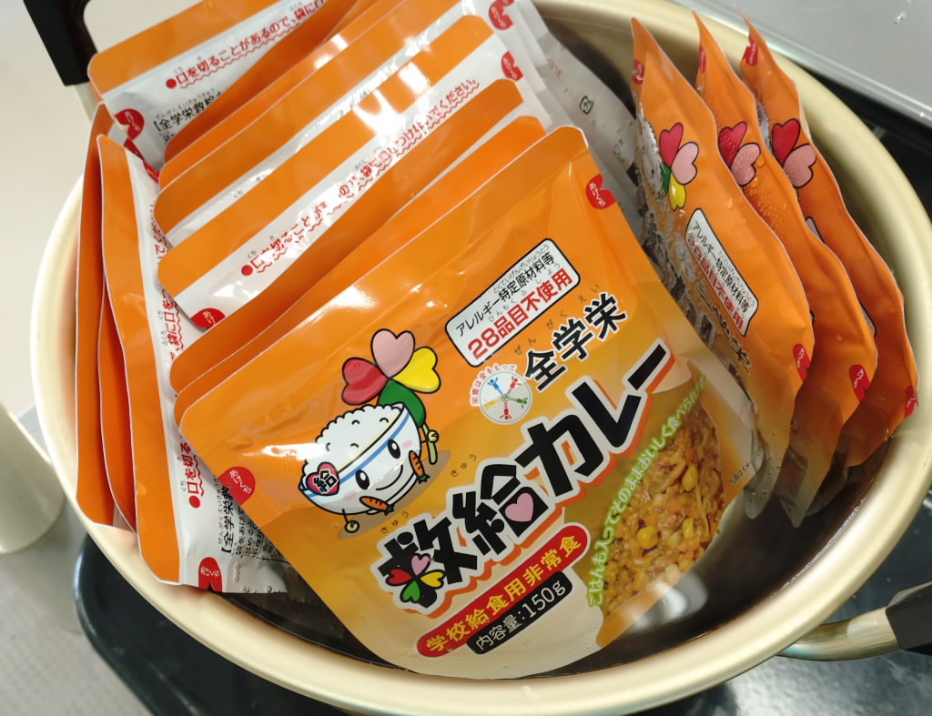配信メールでお知らせしたとおり、給食センターの不具合により「救給カレー」での対応となりました。用務員さんたちのご協力により、鍋で湯煎をして温かくしたものを食べることができました。