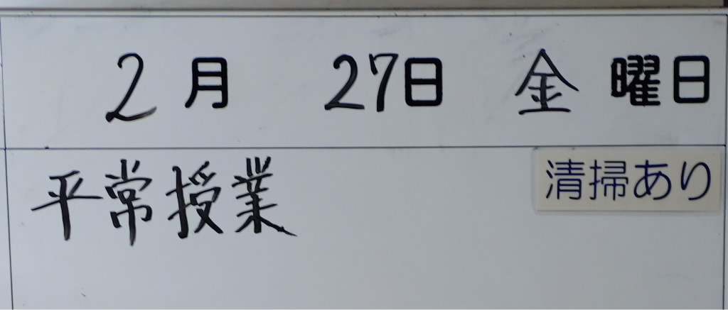 来週の卒業式に向けて、はじめての全校による式練習を行いました。すでに何回かの練習を積んできた卒業生のキリっとした態度もさることながら、そんな3年生の後ろ姿を見た1,2年生も初めてとは思えない態度で練習に臨みました。