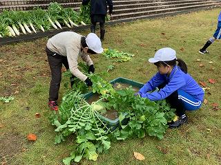 3年生が大根の収穫作業をしました。9月11日の種まき以来、観察やお世話を続けて2か月とちょっと。太くて大きい立派な大根が、50本も収穫できました。おうちで味わってみてください。