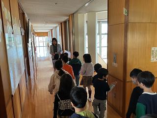1年生が、校内の探検を始めました。 どんなお部屋があるのかな?誰がいるのかな?・・・みんな興味津々です。 教室を訪れると、こんどは体育着に着替えるお勉強。2列に並ぶお勉強。前ならえをするお勉強。 …