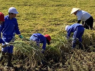 春に植えたかわいらしい苗は、夏の暑さにも負けずにすくすくと育ち、収穫の秋を迎えました。子どもたちは稲刈り鎌を右手に持ち、恐る恐る稲を刈っていきます。要領をつかむと、あちこちからザクザクといい音が聞こえてきました。畔の上では刈った稲を束ねています。地域のボランティアの方から教わりながら、落ちないようにぎゅっと縛りました。