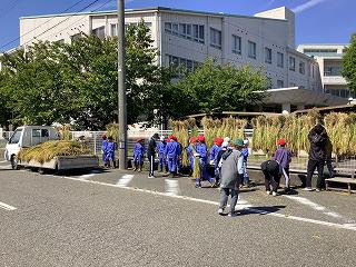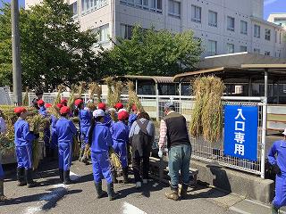最後ははさがけです。学校にはおあつらえ向きのフェンスがありますので、二つに割って上手にかけていました。新米を試食するのが楽しみですね。
