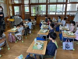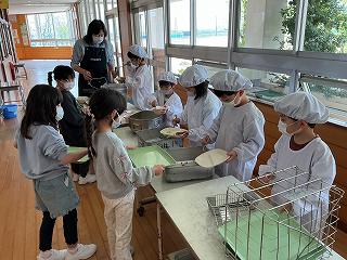 盛り付けのお当番も自分たちで行います。お当番さんたちは、上手に量を加減しながら、丁寧に盛り付けすることができました。そして「いただきます」