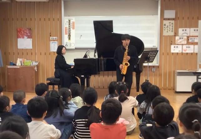 10月20日(月)、音楽のアウトリーチでサクソフォン奏者の方とピアニストの方においでいただき、素敵な演奏を聴きました。サクソフォンの音色でいろいろな感情や風景を表現することができるということに気付き、その音色を味わって聴いていました。