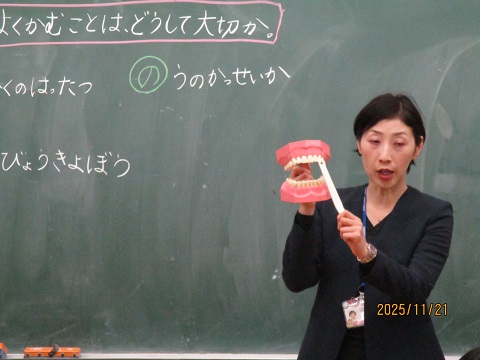 明倫短期大学歯科衛生士学科の計良倫子先生から歯科指導を行っていただきました。 噛むことの大切さや効果的な歯磨きの仕方を教えていただきました。学んだことを今日から実践できるといいですね。