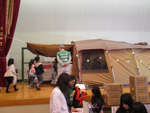 中学生が簡易トイレの設営の仕方を教えてくれました。また、テントや段ボールベッドなどを実際に見ることができました。
