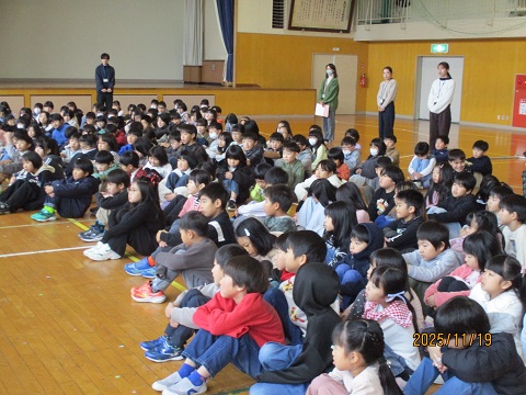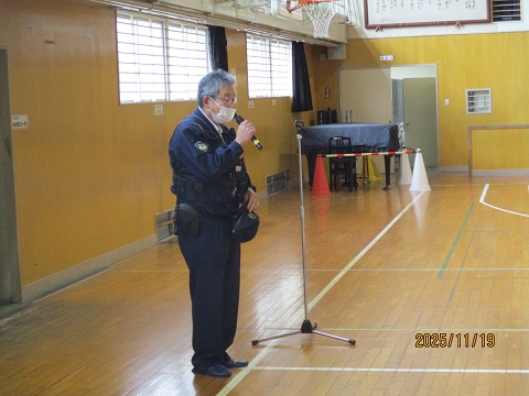 警察署の方から不審者役になっていただき、教室に不審者が入ってきたときの避難訓練を行いました。子どもたちは真剣に取り組んでいました。職員も警察署の方から適切な対応の仕方について教えていただきました。