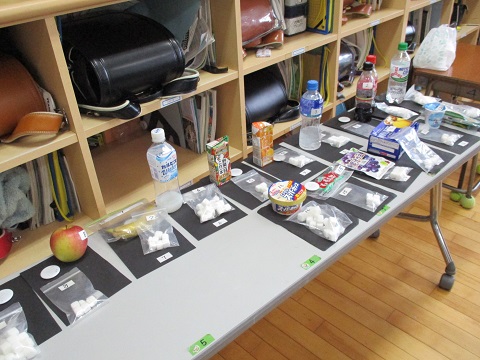 消費生活センターの方からお越しいただき、食品に含まれる砂糖の量について教えていただきました。様々な食品に含まれる砂糖を角砂糖の個数で表し、視覚的に知ることができました。予想より多くの糖分が含まれていることが分かりとても驚いていました。