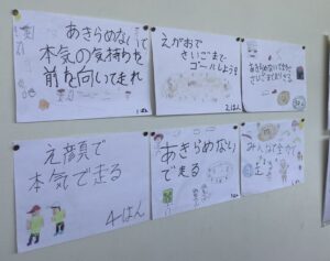 各クラス国語「グループの合い言葉を決めよう」の学習で、マラソン記録会の合い言葉を決めました。その合い言葉を胸に、来週のマラソン記録会では、自己記録の更新を目指して頑張ってほしいと思います。