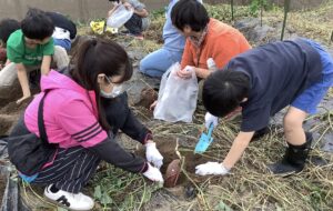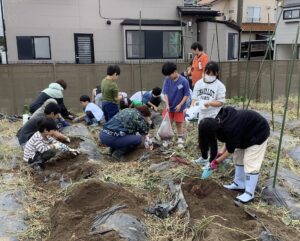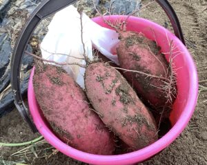収穫したサツマイモは家庭へ持ち帰りをしています。スィートポテトにしたい、天ぷらにしたいなど、とても楽しそうな声が聞こえてきます。地域の達人によると、サツマイモはしばらく置くと甘くなるとのこと…。どうぞ、秋の実りをご家族でご賞味ください!