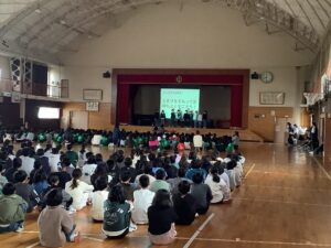 はじめに、人気の児童会キャラクター「横小レンジャー」が登場し、あいさつ・協力・思いやりの合言葉を確認しました。その後、子どもたちが作成した動画を見ることを通して、運営委員会から「学校生活のきまりを守ろう!」と呼びかけがありました。さらに、集会委員会によるダンスパフォーマンスがあり、11月に行なわれる「カラオケ・ダンス大会」のアナウンスがありました。